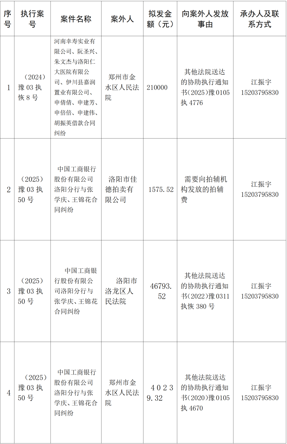 河南省洛阳市中级人民法院关于向案外人发放案款案件的公示
