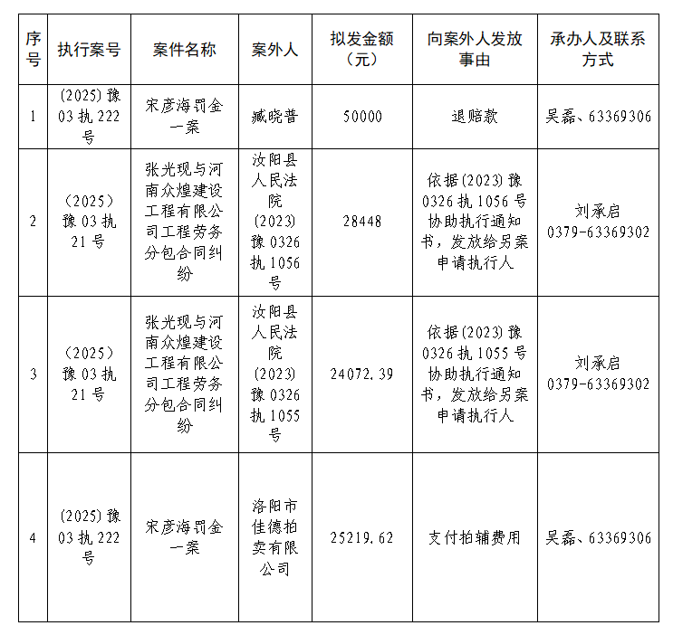 特别提示:公示期满3个自然日后,如无当事人提出异议,则该案款将向案外人发放,监督电话:0379-63369730。