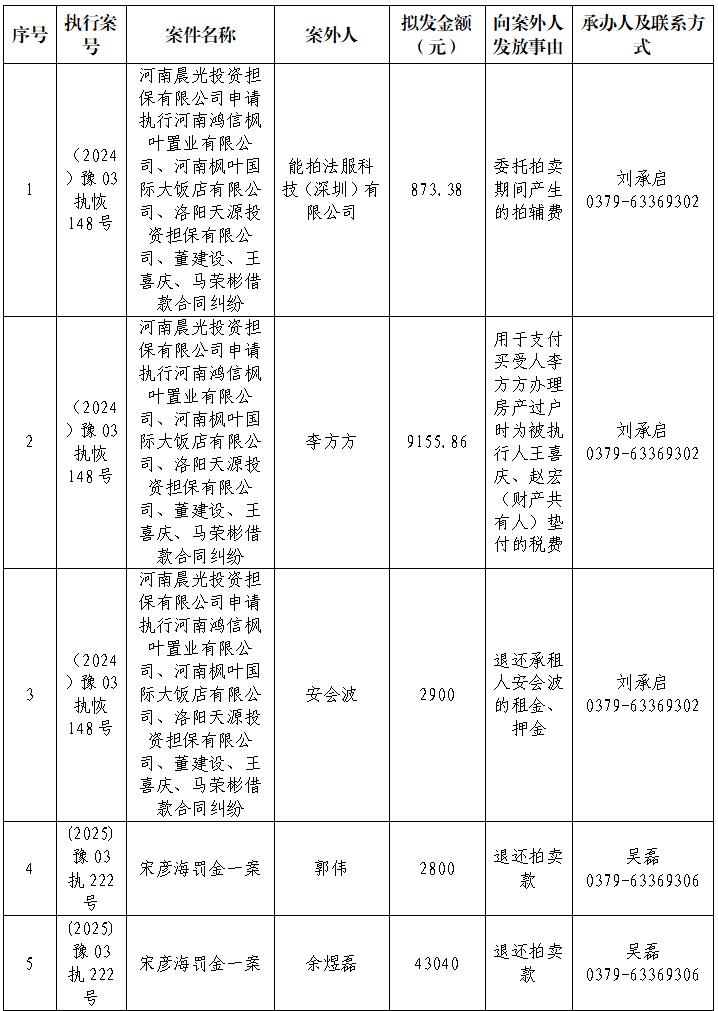 特别提示:公示期满3个自然日后,如无人提出异议,则该案款将向公示案外人发放,监督电话:0379-63369730。
