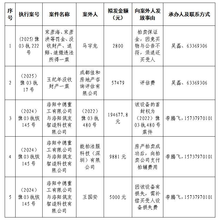 为进一步规范执行案款收发、管理,完善执行案款管理工作,维护当事人合法权益,防患廉政风险,现将河南省洛阳市中级人民法院拟向案外人发放的案款公示如下: