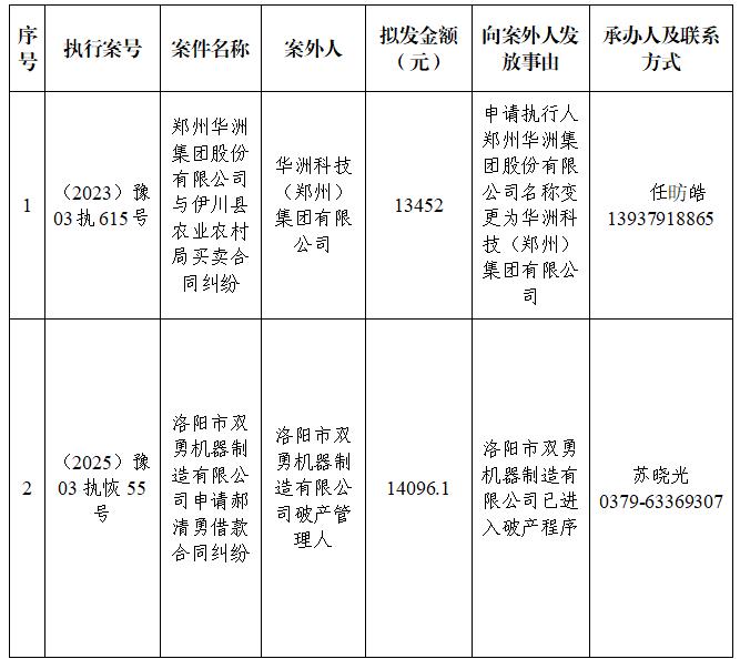 为进一步规范执行案款收发、管理,完善执行案款管理工作,维护当事人合法权益,防患廉政风险,现将河南省洛阳市中级人民法院拟向案外人发放的案款公示如下: