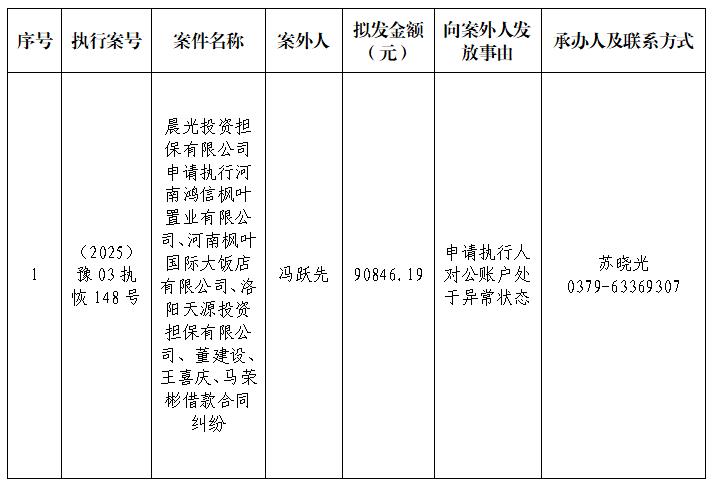特别提示:公示期满3个自然日后,如无人提出异议,则该案款将向公示案外人发放,监督电话:0379-63369730。