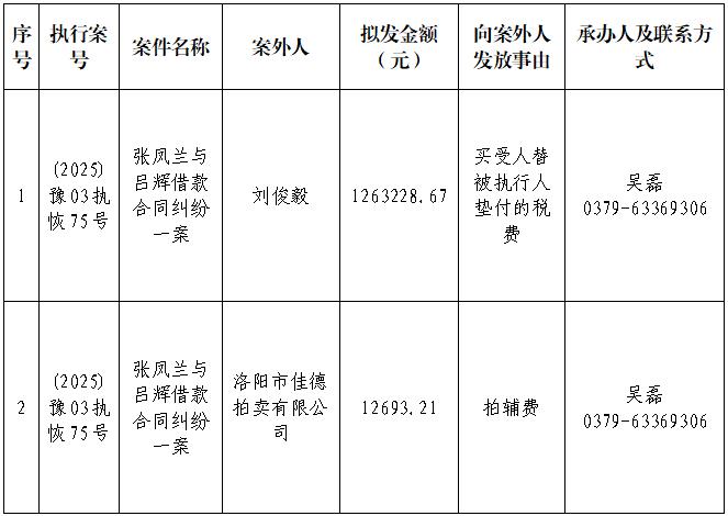 特别提示:公示期满3个自然日后,如无人提出异议,则该案款将向公示案外人发放,监督电话:0379-63369730。