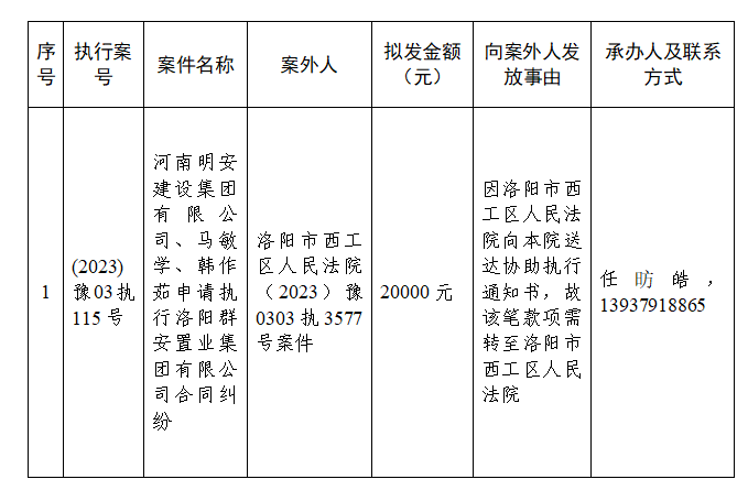 为进一步规范执行案款收发、管理,完善执行案款管理工作,维护当事人合法权益,防患廉政风险,现将河南省洛阳市中级人民法院拟向案外人发放的案款公示如下:
