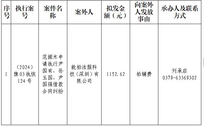 特别提示:公示期满3个自然日后,如无人提出异议,则该案款将向公示案外人发放,监督电话:0379-63369730。
