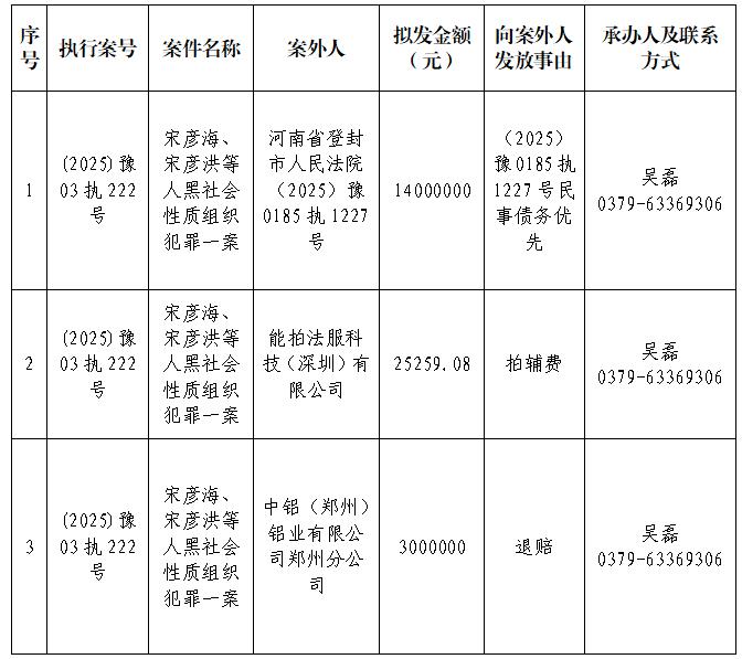 特别提示:公示期满3个自然日后,如无人提出异议,则该案款将向公示案外人发放,监督电话:0379-63369730。