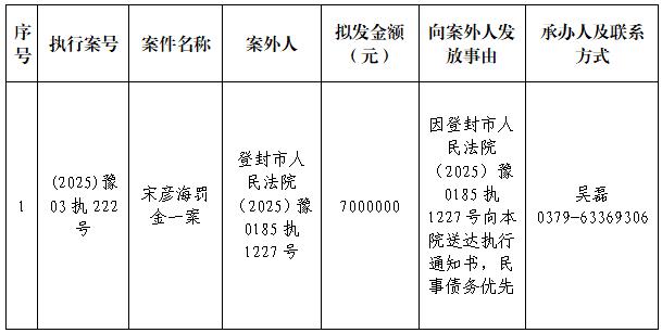 特别提示:公示期满3个自然日后,如无人提出异议,则该案款将向公示案外人发放,监督电话:0379-63369730。