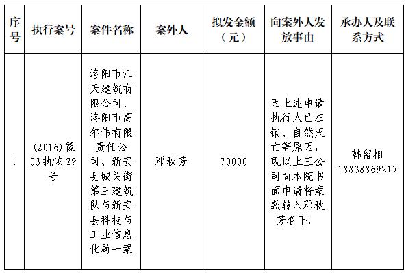 特别提示:公示期满3个自然日后,如无人提出异议,则该案款将向公示案外人发放,监督电话:0379-63369730。