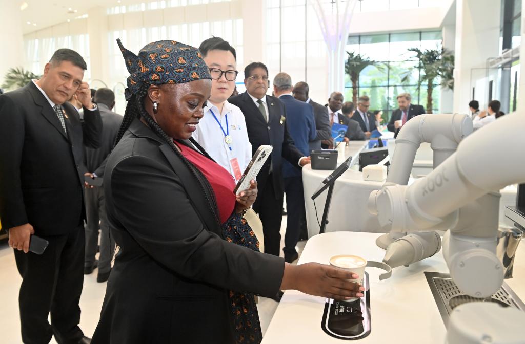 10月29日,驻华使节代表团在中国-东盟国家人工智能应用合作中心参观体验机器人制作咖啡。新华社记者 陆波岸 摄