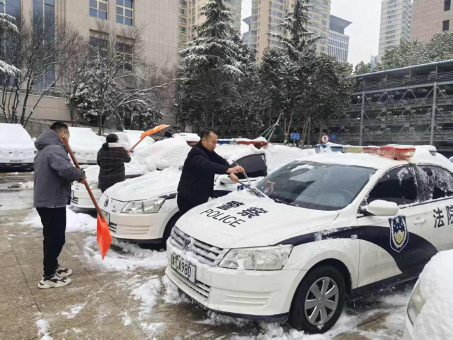 活动中,全体党员手持铁锹、扫帚、雪铲等工具,不畏严寒、分工协作,对院内外主干道、人行通道等区域积雪进行清理;对台阶等关键区域铺设防滑垫;对公务车辆进行清扫,确保车辆随时处于可用状态。