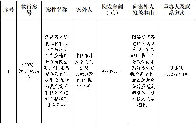 为进一步规范执行案款收发、管理,完善执行案款管理工作,维护当事人合法权益,防患廉政风险,现将河南省洛阳市中级人民法院拟向案外人发放的案款公示如下: