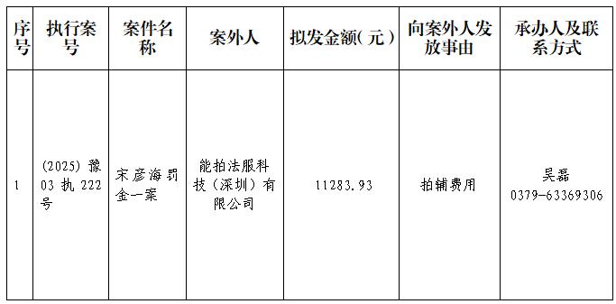 特别提示:公示期满3个自然日后,如无人提出异议,则该案款将向公示案外人发放,监督电话:0379-63369730。