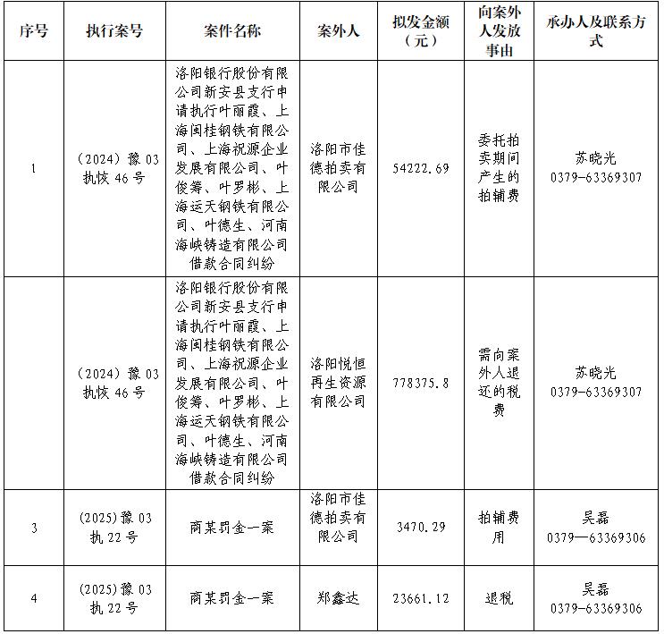 特别提示:公示期满3个自然日后,如无人提出异议,则该案款将向公示案外人发放,监督电话:0379-63369730。