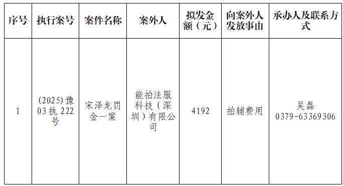 特别提示:公示期满3个自然日后,如无人提出异议,则该案款将向公示案外人发放,监督电话:0379-63369730。