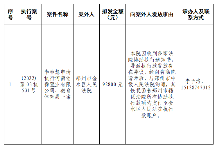 特别提示:公示期满3个自然日后,如无人提出异议,则该案款将向公示案外人发放,监督电话:0379-63369730。