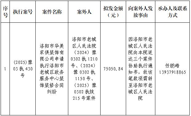 特别提示:公示期满3个自然日后,如无人提出异议,则该案款将向公示案外人发放,监督电话:0379-63369730。