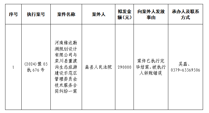 特别提示:公示期满3个自然日后,如无人提出异议,则该案款将向公示案外人发放,监督电话:0379-63369730。