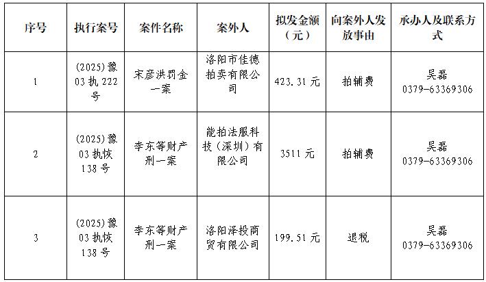 为进一步规范执行案款收发、管理,完善执行案款管理工作,维护当事人合法权益,防患廉政风险,现将河南省洛阳市中级人民法院拟向案外人发放的案款公示如下: