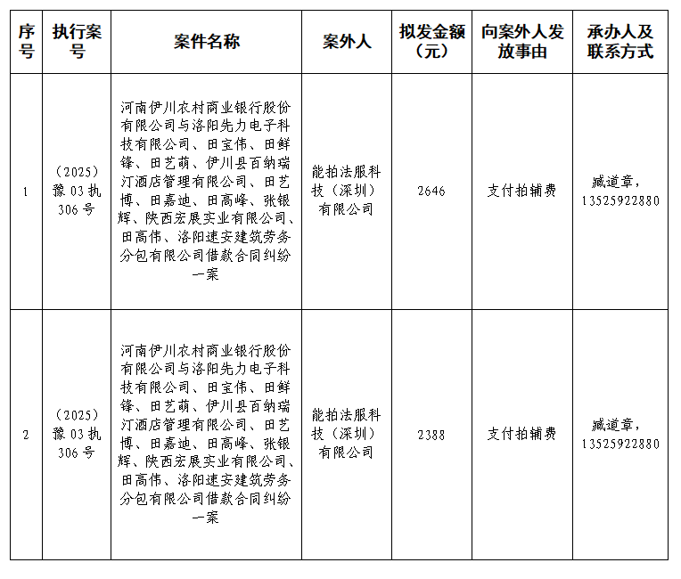 为进一步规范执行案款收发、管理,完善执行案款管理工作,维护当事人合法权益,防患廉政风险,现将河南省洛阳市中级人民法院拟向案外人发放的案款公示如下: