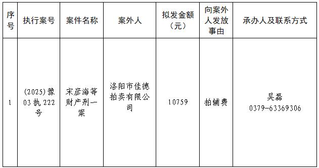 特别提示:公示期满3个自然日后,如无人提出异议,则该案款将向公示案外人发放,监督电话:0379-63369730。