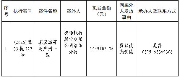 特别提示:公示期满3个自然日后,如无人提出异议,则该案款将向公示案外人发放,监督电话:0379-63369730。