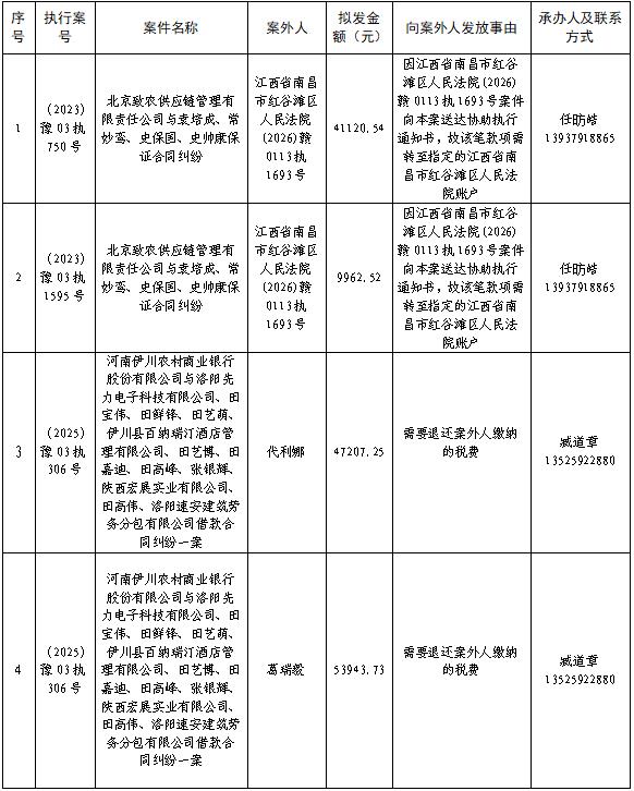 特别提示:公示期满3个自然日后,如无人提出异议,则该案款将向公示案外人发放,监督电话:0379-63369730。